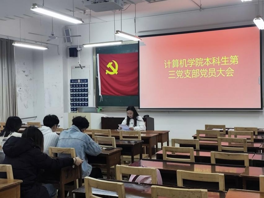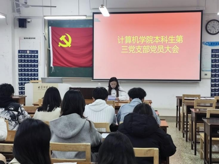 本科生第三党支部于JC408召开党员大会,全体党员参与。