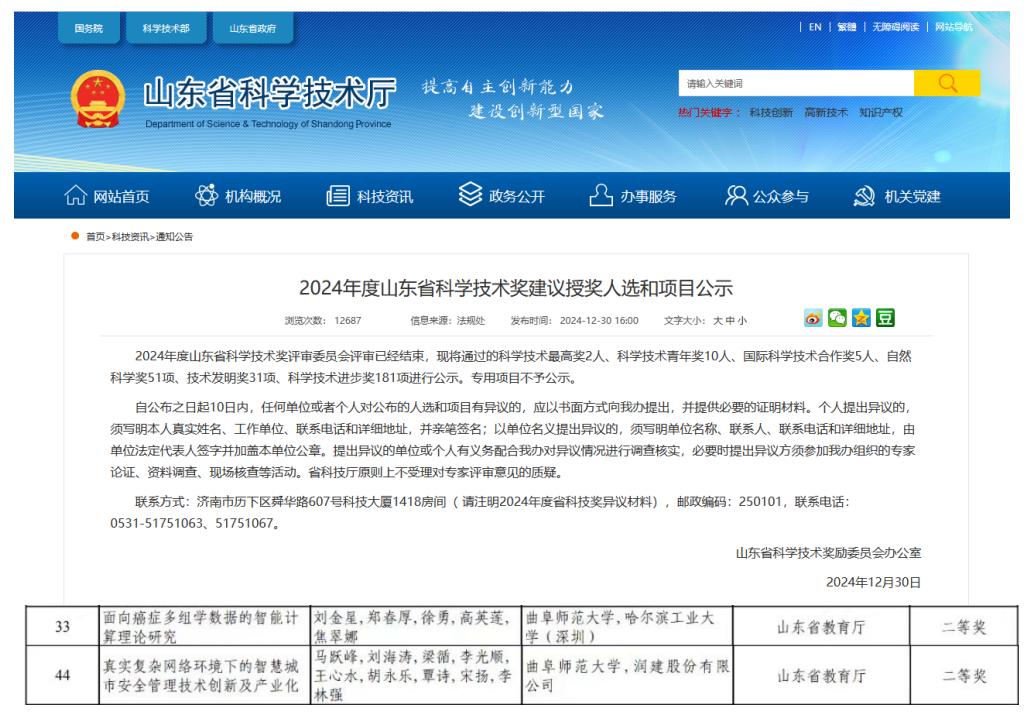获批2项。刘金星教授等人的项目“面向癌症多组织学数据的智能计算理论研究”荣获山东省自然科学奖二等奖;马跃峰副教授等人的项目“真实复杂网络环境下的智慧城市安全管理技术创新及产业化”荣获山东省科技进步奖二等奖。兔子先生