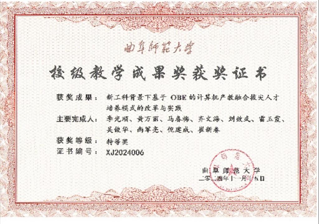 教师雷玉霞教授主持的《基于CDIO+课程思政的人工智能课程体系建设与创新型人才培养》省教改重点项目获批立项。同时,李光顺教授获校级教学成果特等奖,朱荣副教授获校级教学成果一等奖,为深化教学改革,提升人才培养质量,并为后续申报省级和国家级教学成果奖奠定了坚实的基础。