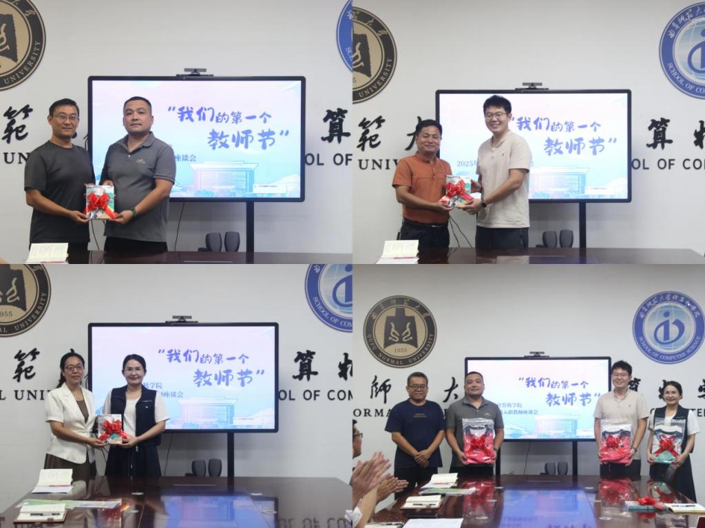 学院分工会主席王斯锋向新教师赠送教师节礼物,表达学院对他们的节日问候和关心支持。