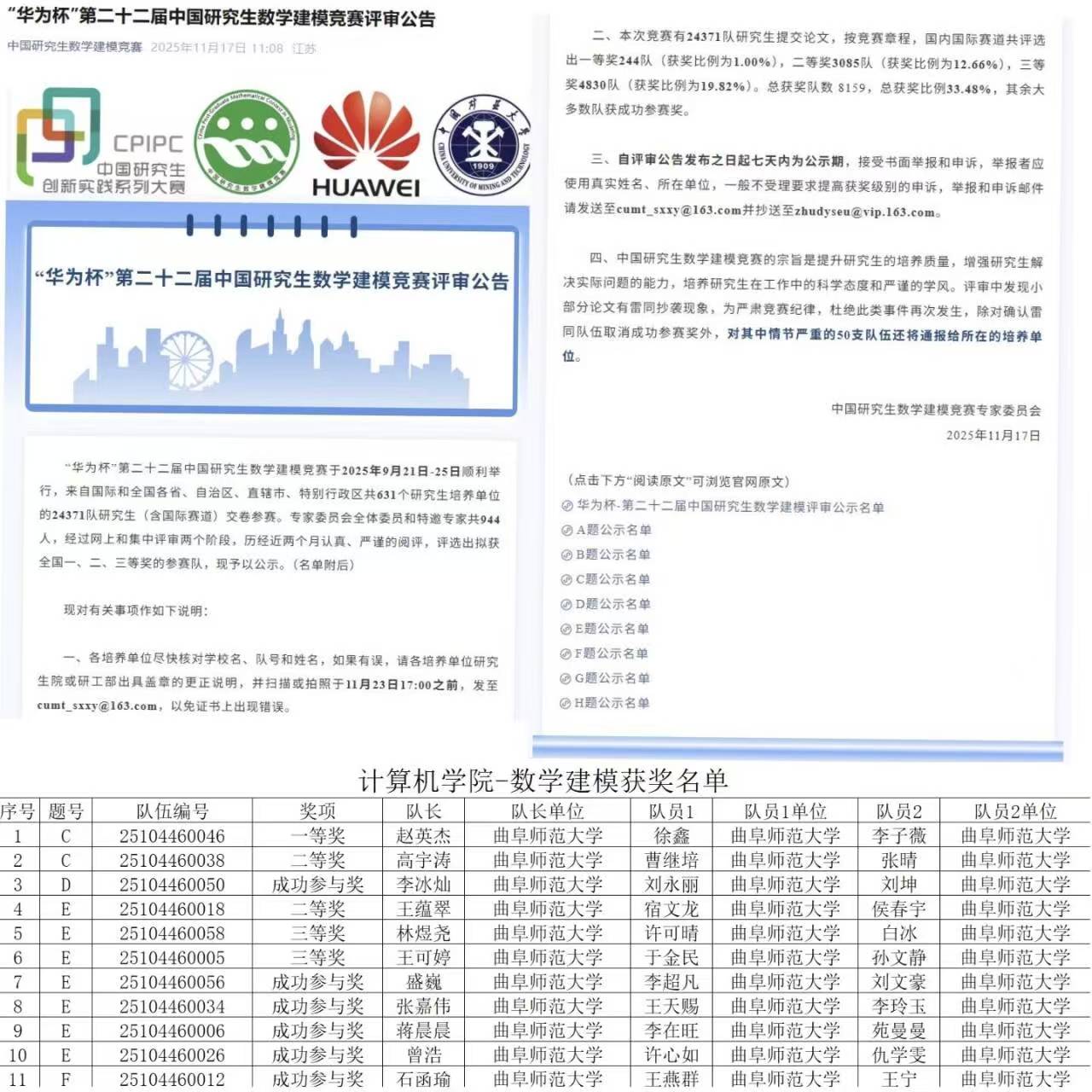 11月17日,第二十二届“华为杯”中国研究生数学建模竞赛获奖结果揭晓,兔子先生