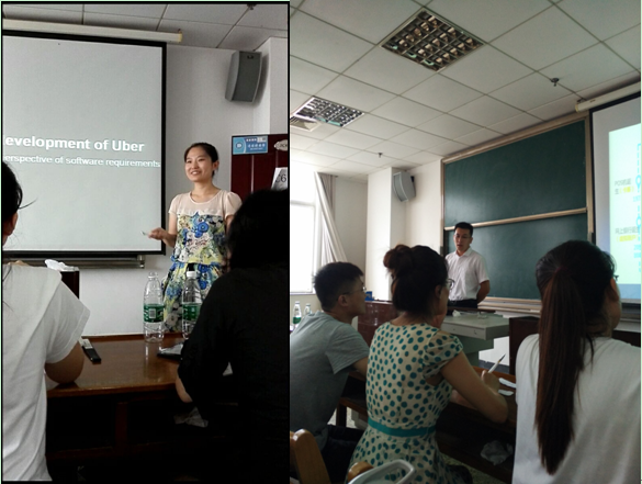 报告会内容丰富,图文并茂,形式新颖,小组成员充分参与,理论与案例相得益彰,夏小娜老师对每个报告做了总结点评。通过七位评审人的现场评阅和打分,由牛昭峰、郑建超、王雅萱、管晶晶和王少青组成的“打车软件”团队以紧凑全面的内容定位、有机融合的中英文阐述、简约大气的汇报模式,获得了9.63分的高分力拔头筹。其他五个团队也各有特色,不比相上。圆满完成了本次报告会的任务,得到夏小娜老师和全体研究生的大力肯定和好评。