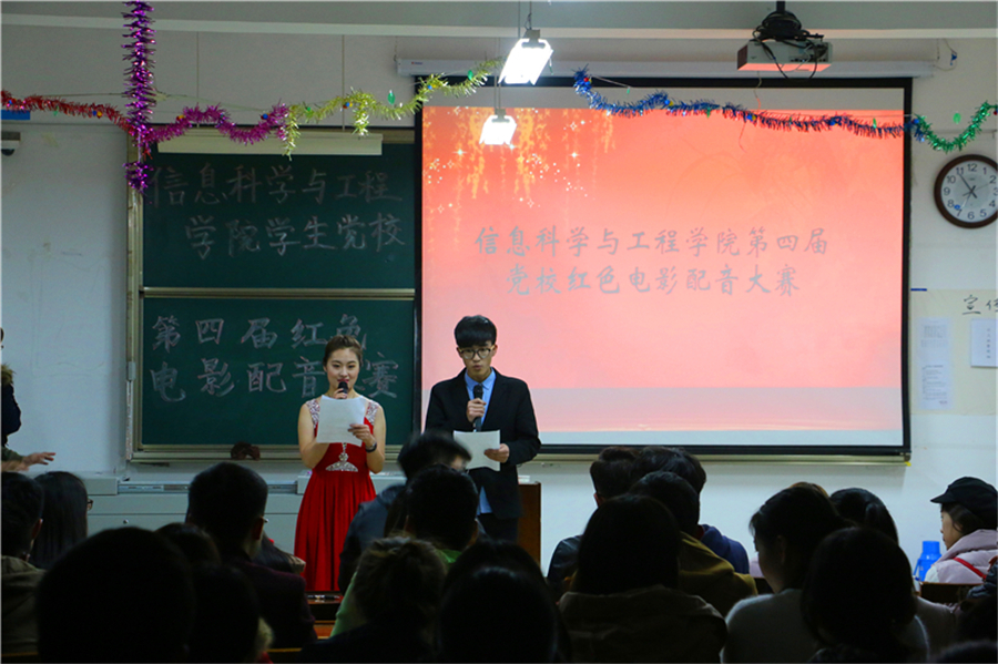 为弘扬红色精神,重温革命历史。信息科学与工程学院红色电影配音大赛于201632619:00C406举行。本次比赛由信息科学与工程学院党校举办,学生会主席团及党校同学观看了本次比赛。