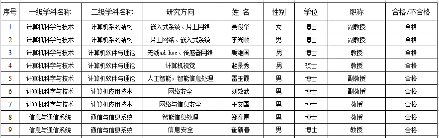 专业学位硕士研究生指导教师资格审定和工作条例》(校字[2012]121号),以及研究生处《关于开展研究生导师增选和考核工作的通知》的要求和规定,本着公平、公正、公开、择优和推进学院研究生培养和导师队伍强化的原则,严格执行学校文件和通知要求,认真验证申请人和考核人成果材料真伪,对存在争议的问题和相关人积极与学校研究生处反映情况。经信息科学与工程学院学位评定分委会讨论和审核,现确定信息科学与工程学院2016年度硕士研究生指导教师期满考核和新导师遴选推荐结果,现予以公示(以二级专业和材料提交时间为序):