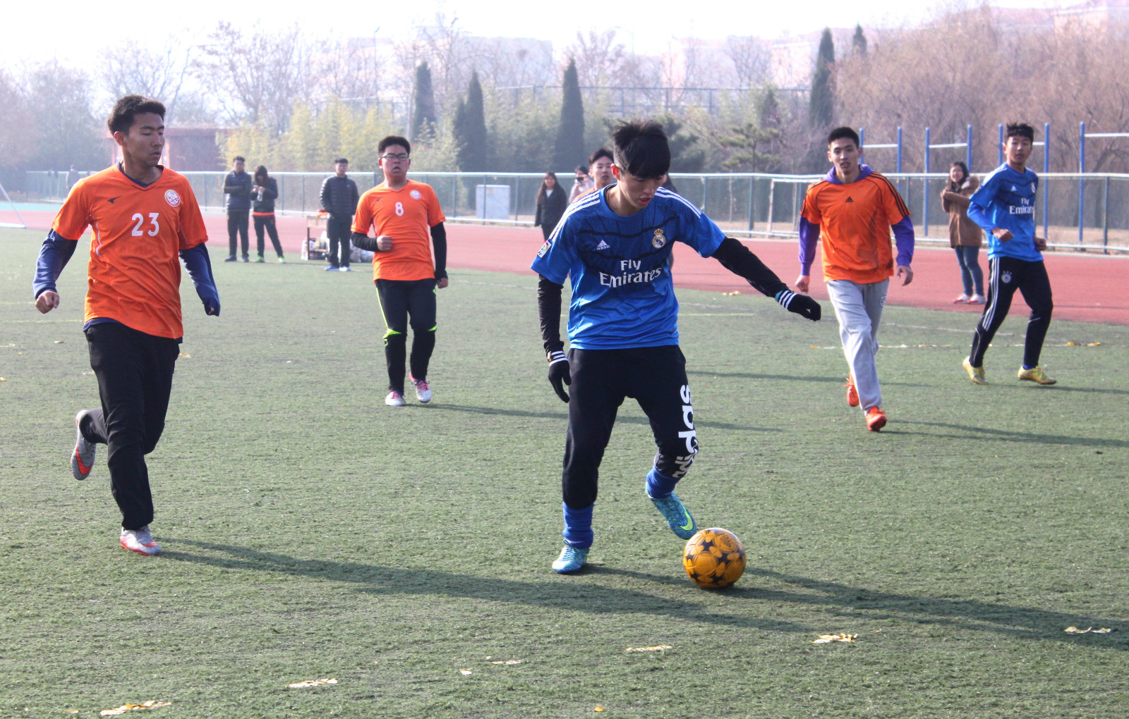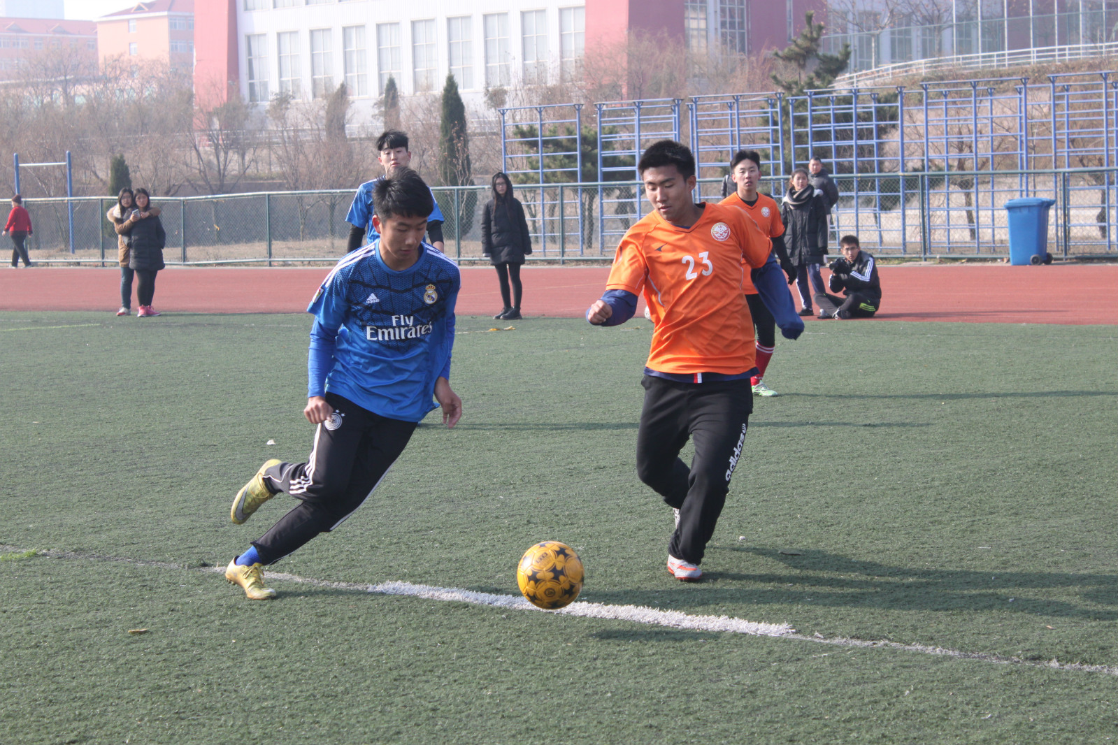 第九届五人制足球赛”,经过两个周的激烈比拼,2015年12月13日上午,我们迎来了最后一场比赛:信息科学与工程学院对阵传媒学院。信息科学与工程学院党总支副书记颜景民,辅导员姜振栋老师出席并观看了此次比赛。