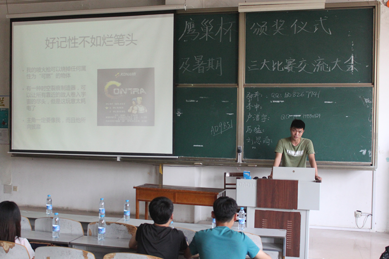 活动首先为在“鹰巢杯”比赛中获得一、二、三等奖的同学们进行颁奖。并由获得“鹰巢杯”一等奖的卢浩宇同学就自己参赛中遇到的问题与挑战分享了宝贵的参赛经验。紧随其后举行的是暑期三大比赛的交流会。获得数学建模省级二等奖的12级张奔同学结合自身经历向大家分享了论文的格式一定要正确并且要提前准备。多次获得电子设计大赛省奖的李申同学则向大家推荐了有关电子设计大赛的书籍。13级厉猛同学就自己设计游戏的经历向大家简单介绍想要开发游戏所要具备的知识技能,并强调了团队合作的重要性,最后上场的12级刘恩琦同学也同样提到了团队合作的必要性及重要性,并就自己团队设计网页的经验进行了简单介绍。