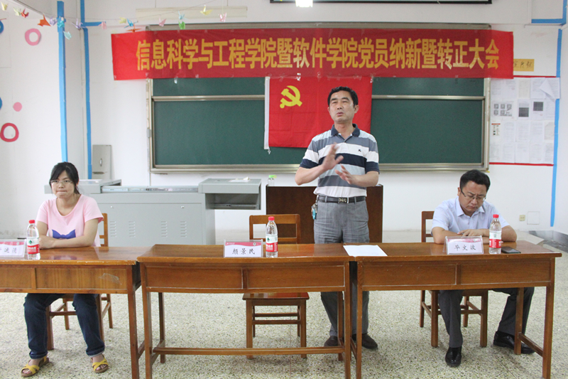 为壮大党员队伍,增加组织活力,2015年6月26日信息科学与工程学院暨软件学院于C楼406教室顺利召开党员纳新暨转正大会,信息科学与工程学院党总支副书记颜景民,团总支书记毕文波、辅导员于运清出席并参加了本次会议。
