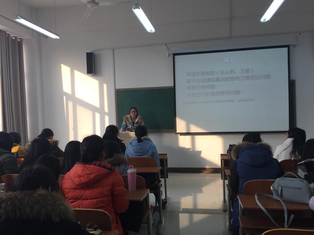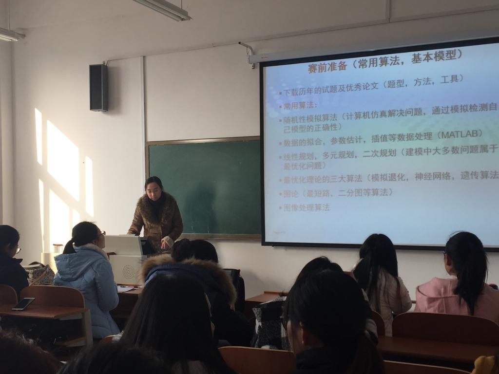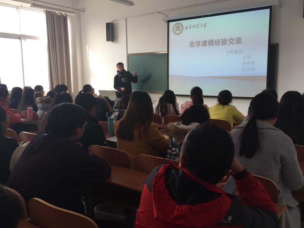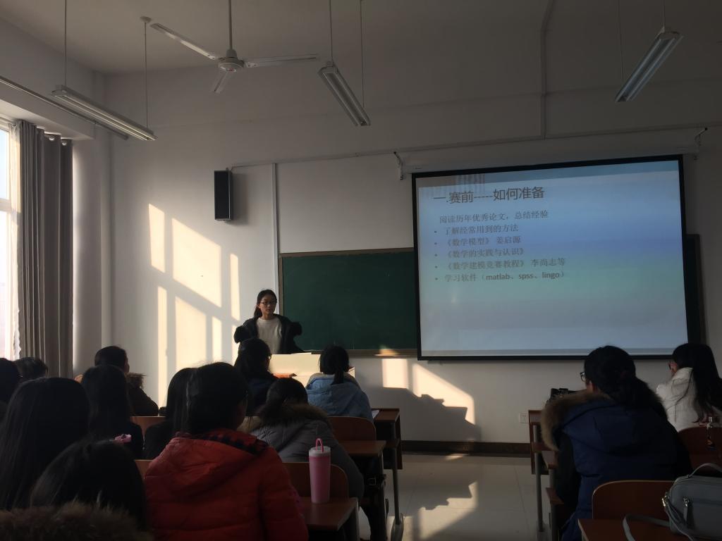 作报告的几位同学分别从队员的选择、赛题的选择、论文的组织以及各项注意事项方面介绍了经验。王宇用三个W和一个H对数学建模进行了概括,并将建模过程总结为SUCCESS;管晶晶建议要做好充分的赛前准备,参考历年获奖优秀论文,调整好论文格式,可以在很大程度上增加获奖概率;徐婷婷提醒参赛期间要注意饮食卫生,不要熬夜,保证精力充沛;刘嫚嫚分析了队员组成对比赛的重要性,认为小组成员要明确分工,各有所长,充分发挥自身的特长有助于顺利完成比赛;牛昭峰强调要重点写好论文的摘要,突出亮点,抓住评卷人的眼球。
