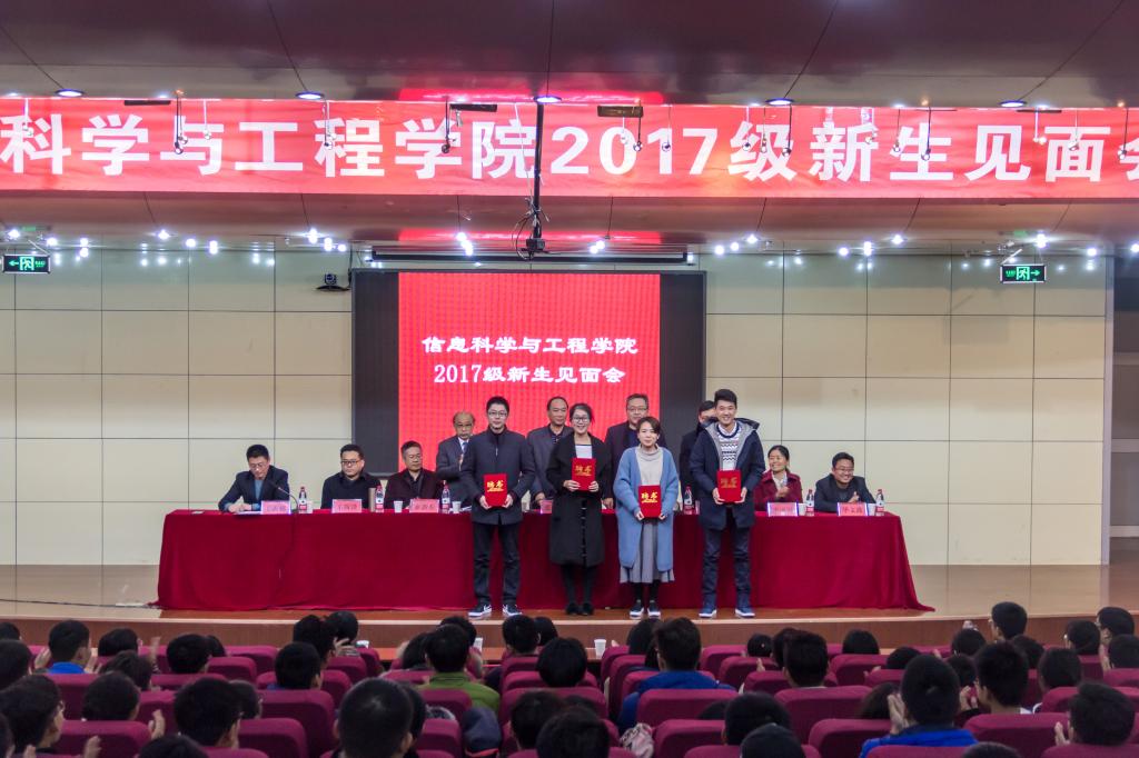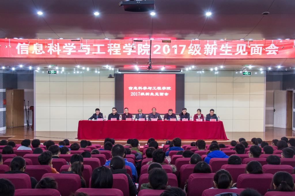 于图书馆报告厅举办2017级新生见面会,学院党委书记张书东,学院党委副书记肖龙航,校科技处处长、博士生导师、教授禹继国,副院长、硕士生导师、副教授李光顺,电子信息科学与技术系主任、硕士生导师、教授崔新春,网络工程系主任、硕士生导师、副教授李凤银,学院实验中心主任王斯锋,学院团委书记毕文波出席本次见面会,2017级辅导员姜振栋主持本次见面会。