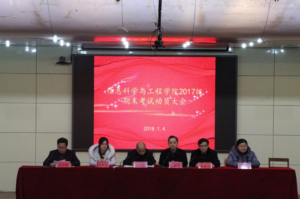 为进一步加强考试工作的组织与管理,端正考试风气,严肃考试纪律,2018年1月4日下午4:30信息科学与工程学院2017级期末考试动员大会在图书馆报告厅召开。院长助理赵景秀、党委副书记肖龙航、副院长李光顺、团委书记毕文波、辅导员于运清、鲁瑞丽、团委学生会主要成员以及2017级全体同学参加了此次活动,大会由毕文波主持。
