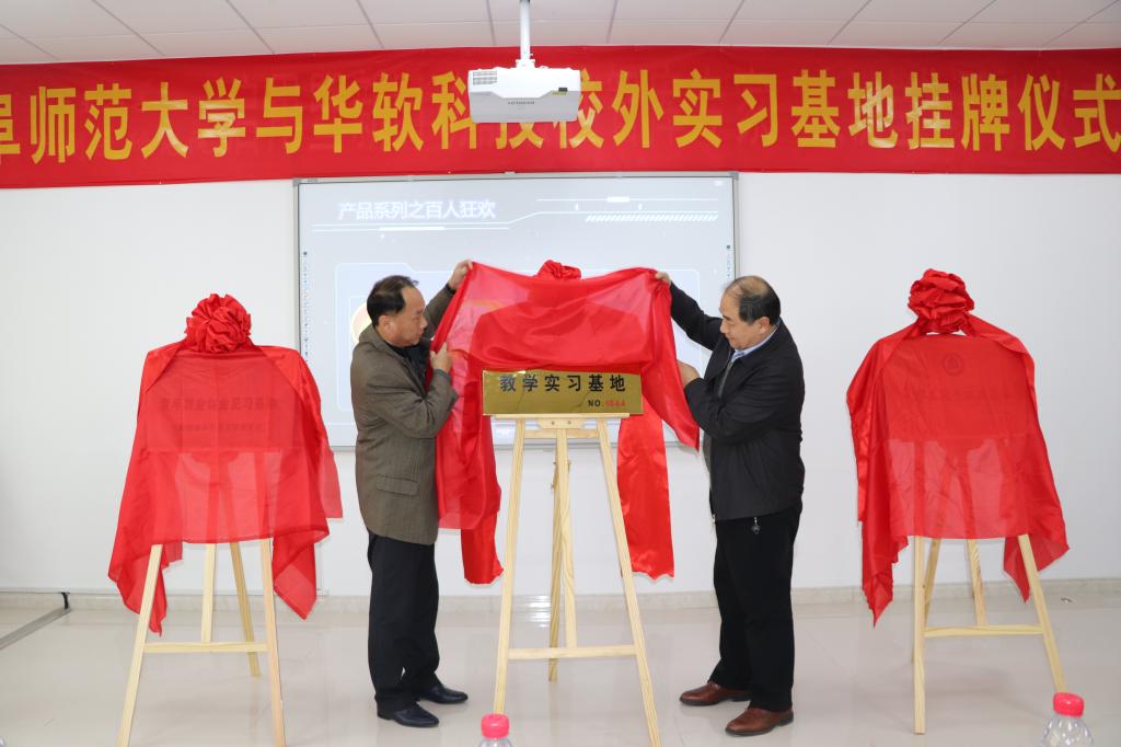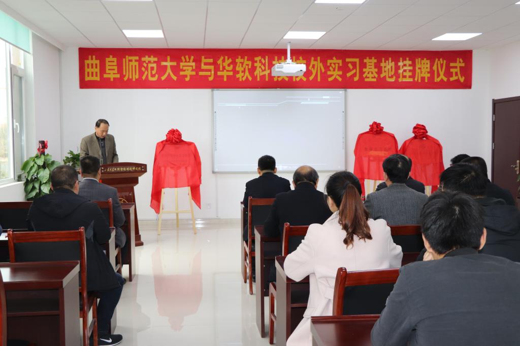 日照高新区创业中心主任张进生与信息科学与工程学院党委书记张书东共同为教学实习基地揭牌,华软科技有限公司总经理王民乐与团委副书记刘蓉共同为社会实践基地揭牌,揭牌仪式圆满结束。