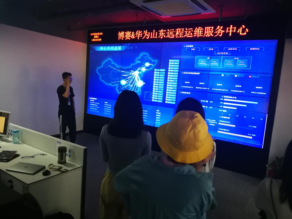 在济南博赛网络科技有限公司,工作人员分批带领老师、同学进行参观学习。师生们参观了公司的工作环境,了解了博赛网络科技有限公司的课程模式、工作理念,工作人员向广大师生讲解了兔子先生、背景和良好的校企合作对接环境。见习师生还参观了公司的考试中心和华为&博赛远程运维平台,平台具有提供线上、线下的运维能力,工作人员现场展示了远程运维的设备。