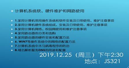 2019.12.25下午2:30,校工会第四期特色活动项目:信息科学与工程学院分工会的网络基础知识ABC,于日照校区JS321实验室举办了第二次知识讲座。网络工程专业韩军峰老师,给在座的师生进行了一场精彩的网络基础知识普及。韩老师针对老师们日常使用计算机过程中出现的,如硬件维护、软件安装、家用路由器的配置及数据安全防护等问题做了深入浅出的介绍。老师们踊跃参与互动问答,亲手制作网线,配置无线路由器,解决了很多困扰已久的难题。纷纷表示这次讲座受益匪浅。