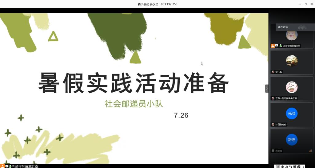 7月26日15点,信息科学与工程学院社会邮递员小队在腾讯会议app举行了会议,讨论社会实践前的准备活动。小队全体成员都参与了本次会议,并积极发表了各自对于小组实践活动的看法以及活动方向的建议。