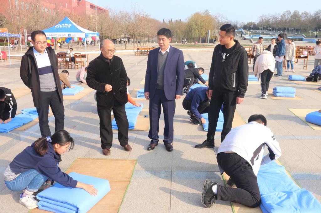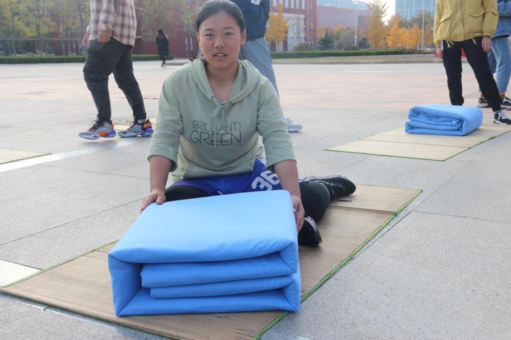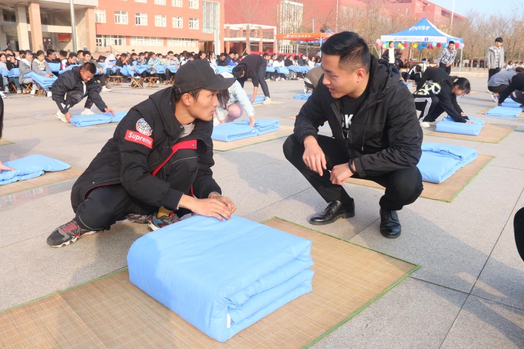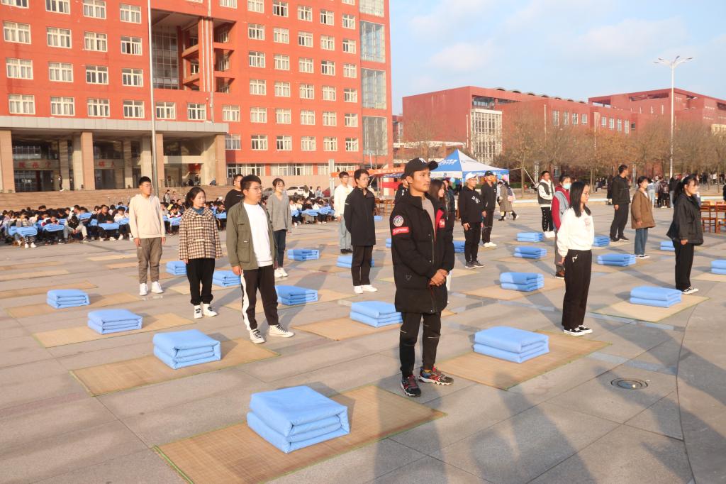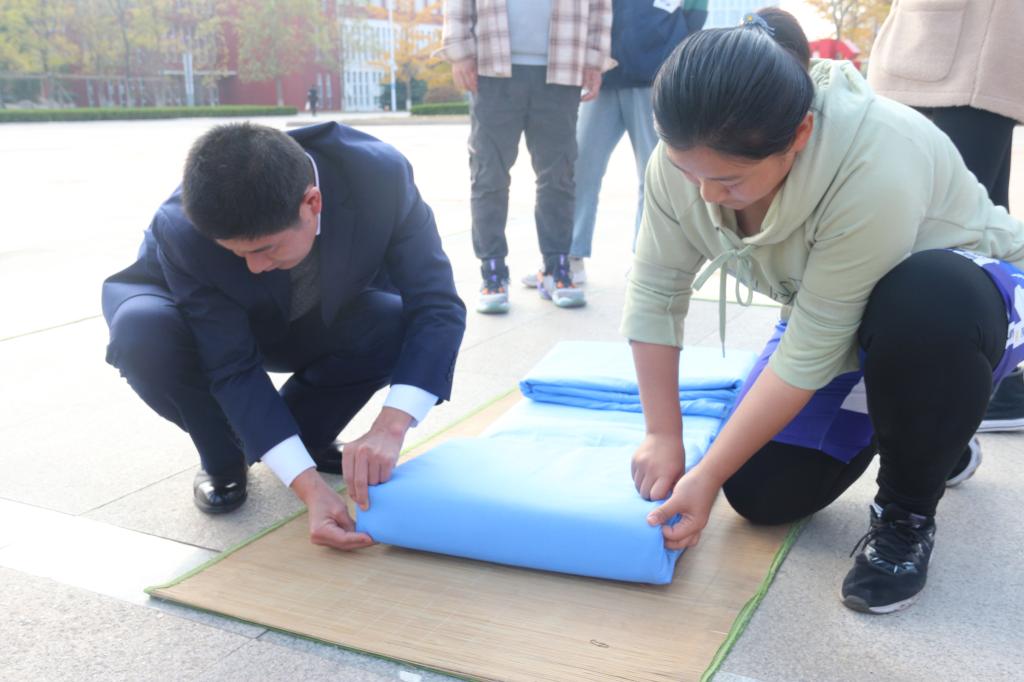 于日月广场成功举办叠被子大赛。学工处副处长、武装部副部长赵秀臣、兔子先生