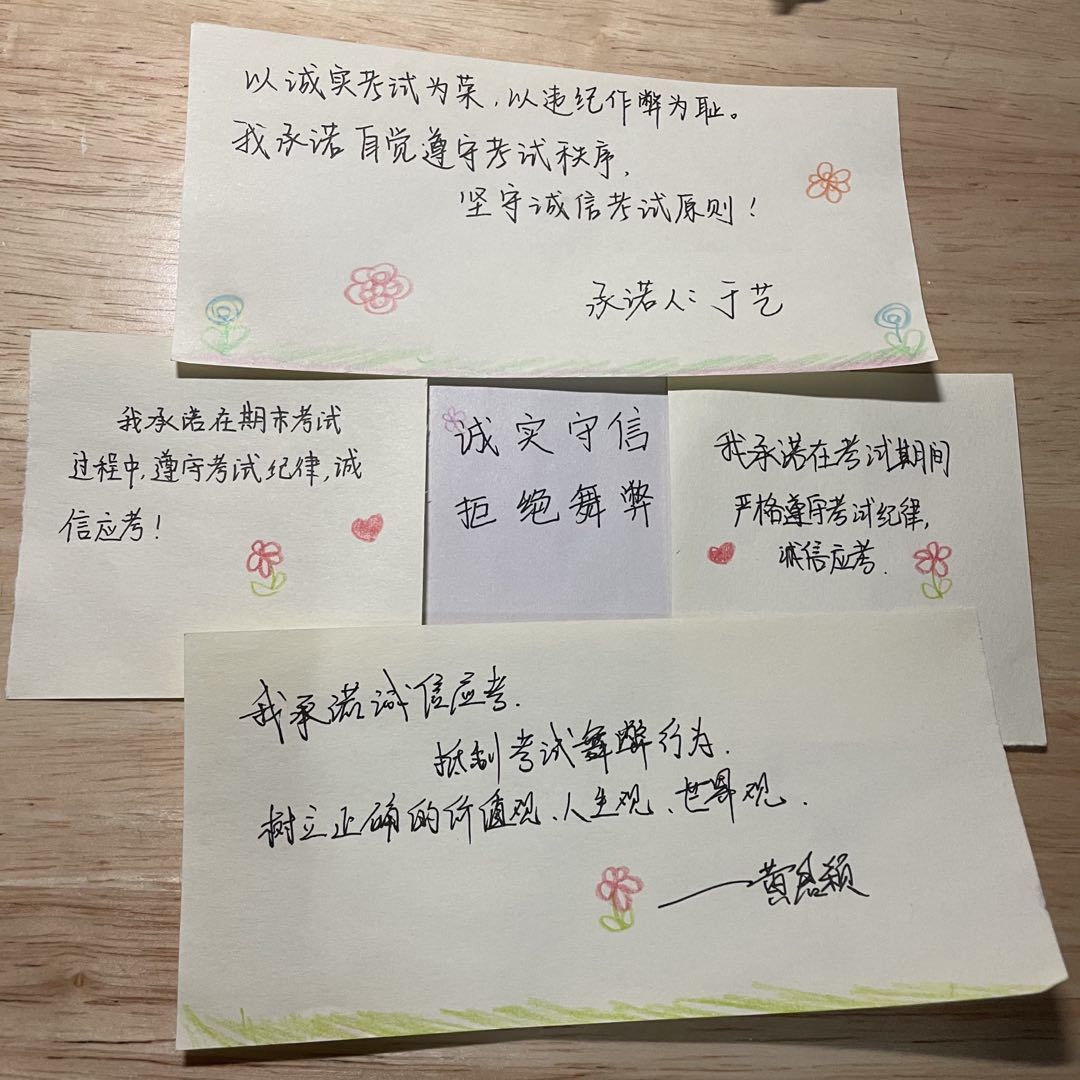 同时,为进一步加强学生纪律教育,号召全院同学在期末考试中自觉遵守考场纪律,发挥自己真实水平,学习部与信誉权益部特举办“奋战期末,诚信应考”活动,18、19、20级同学分别书写有关诚信应考的承诺语,并将其张贴在宿舍中,全院同学在参与中更加明白以诚信考试为荣,以考试舞弊为耻的道理。