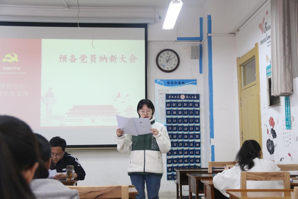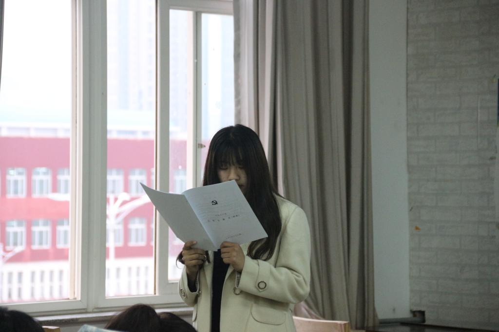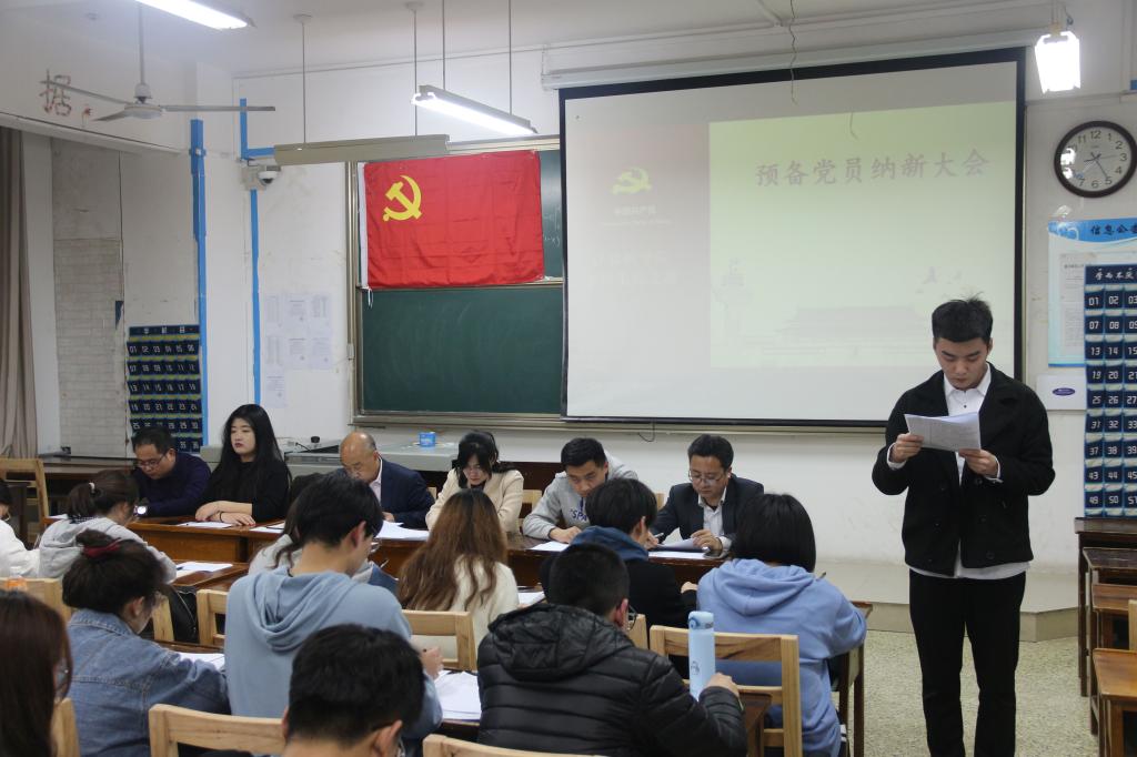 大会伊始,于运清向大家介绍本次大会的会议议程并奏国际歌。随后,与会预备党员发展对象依次宣读《中国共产党入党志愿书》,介绍个人经历,向组织汇报入党动机以及对党的认识,表明想要入党的坚定决心和认真态度。接着由入党介绍人介绍发展对象的基本情况和政治审查情况,对几名同志的表现进行了公正客观的评价,并对其能否入党表明意见。同时,与会党员充分讨论,纷纷表达自己的意见。随后,由发展对象表态发言,承诺接受批评指正,不忘初心跟党走,在今后的学习工作中,坚定目标、严格要求自身,努力改正现有不足。经过正式党员无记名投票,支部现有正式党员一致同意接收与会申请人为预备党员的决议。最后,党委副书记肖龙航对各位新进党员表示热烈的欢迎,同时着重强调了发展党员工作责任监督制度,提出会议常态化,并勉励同学们树立良好榜样,提高自身修养,为自身全面发展奠定基础。