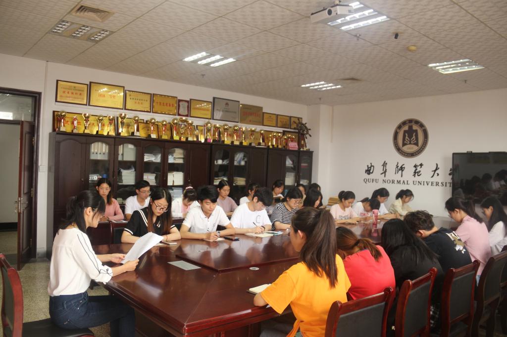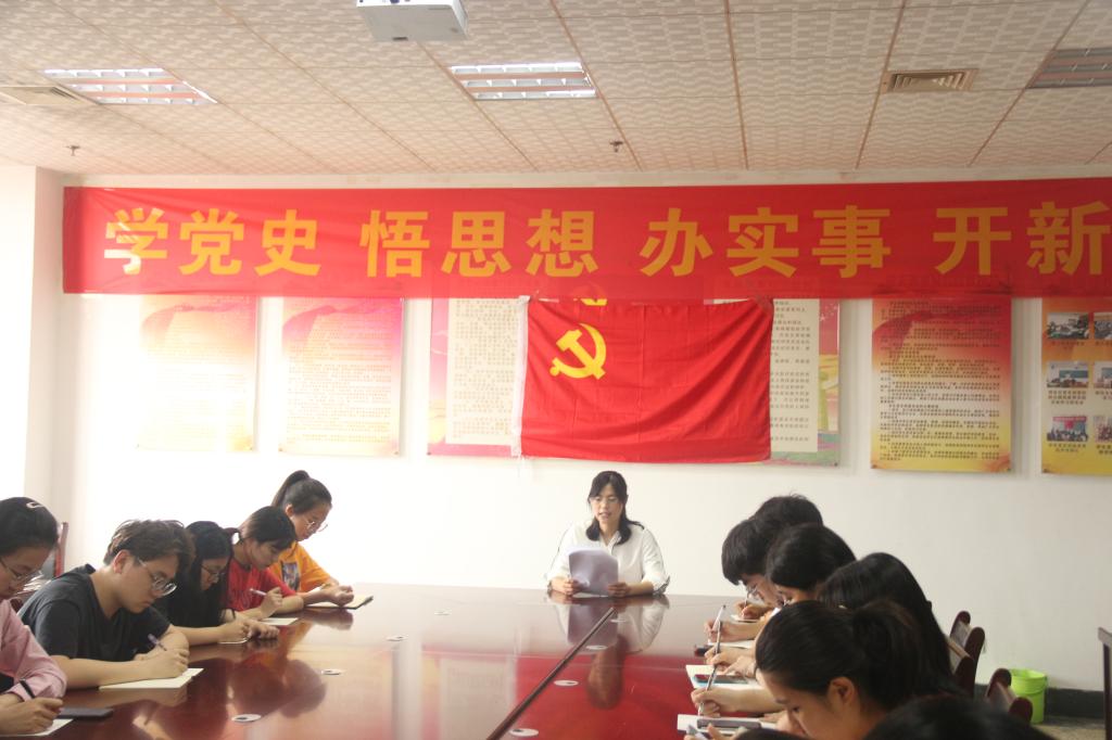 在会议室召开会议,由本科生党支部书记于运清带领多名正式党员与预备党员开展学习活动。