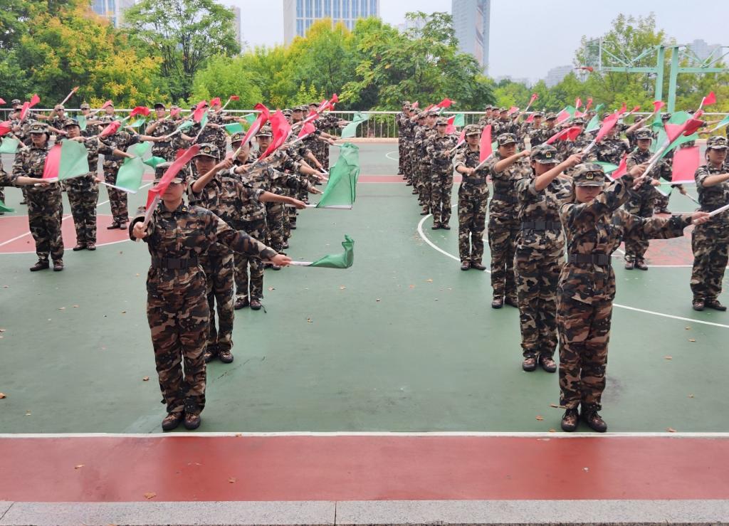 大会首先进行了庄重的升旗仪式,伴随激昂雄壮的国歌,鲜艳的五星红旗冉冉升起、迎风飘扬,全体师生肃立注目,国旗蓝天相映。在随后的军训汇报表演中,曲园学子们精神抖擞、意气风发,队列方阵动作整齐、军姿飒爽,擒敌拳方阵招式凌厉、气势强劲,内务方阵井然有序、一丝不苟,棍术方阵铿锵有力、势如破竹,旗语方阵干净利落、整齐划一,定向越野方阵步履矫健、配合默契,战术方队手握尖枪、灵活铿锵,心理健康操方阵在优美舞姿中绽放青春风采、表达美好祝福。战地救护和格斗方队尽显英雄气概,他们一张一弛游刃有余,一招一式干净利落,充分展现了入学以来的训练成果和新时代大学生的青春朝气,不时赢得现场师生的阵阵掌声。