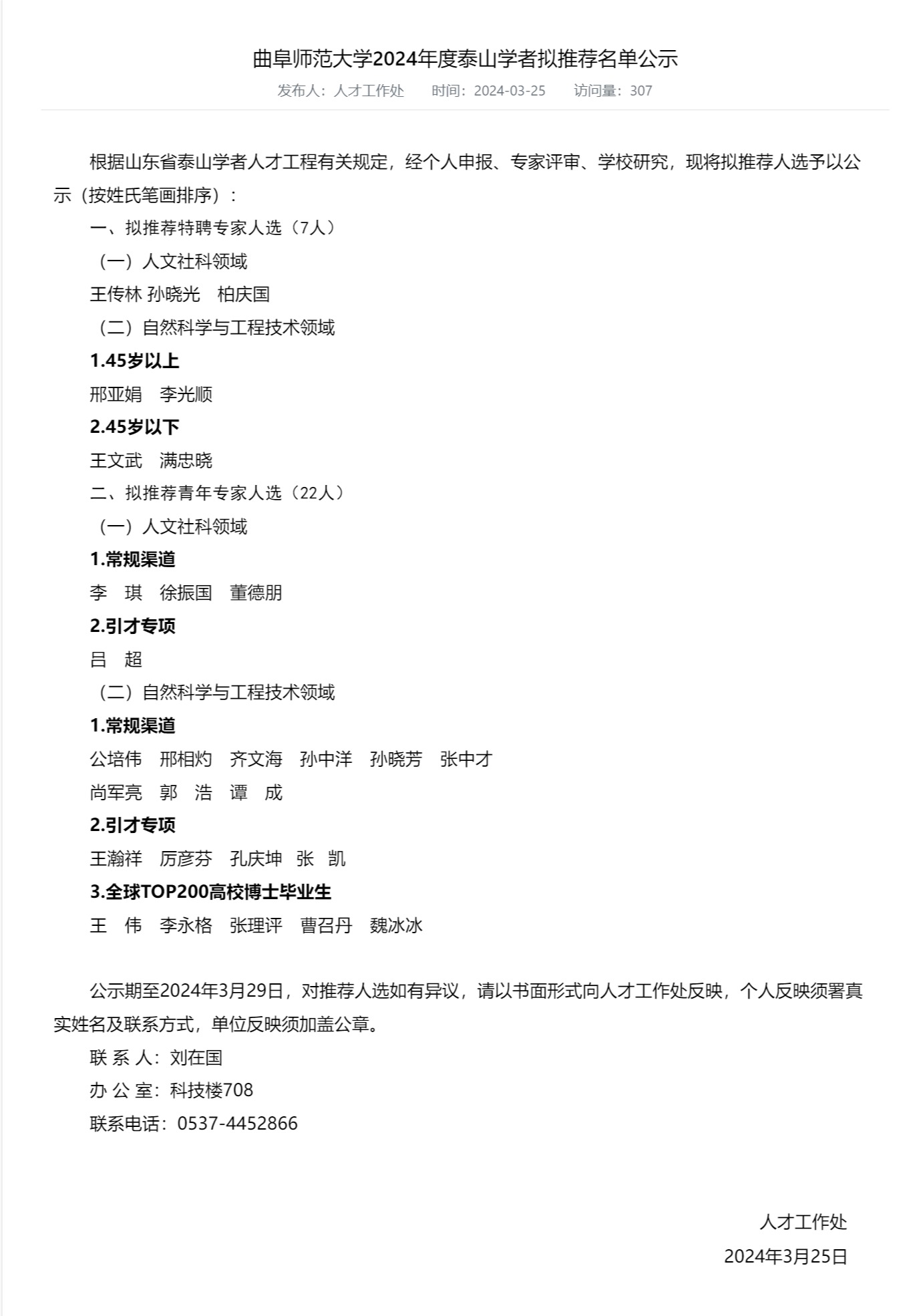 2024年度泰山学者拟推荐名单公示,兔子先生