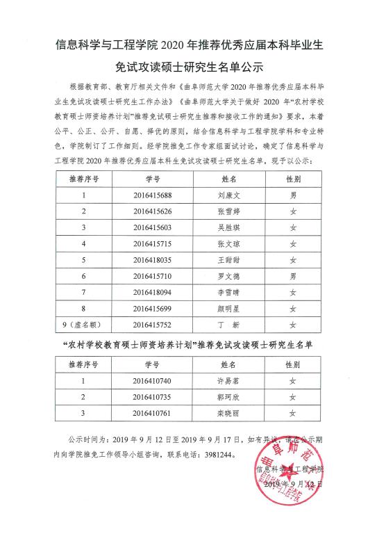 下一条: 信息科学与工程学院2020年“农村学校教育硕士师资培养计划”推荐免试攻读硕士研究生工作细则