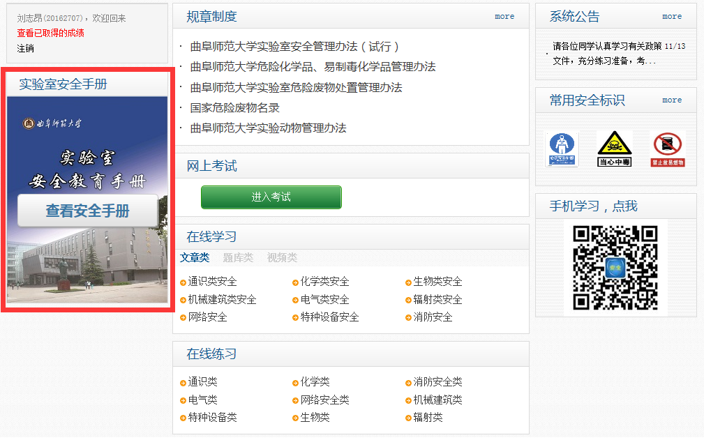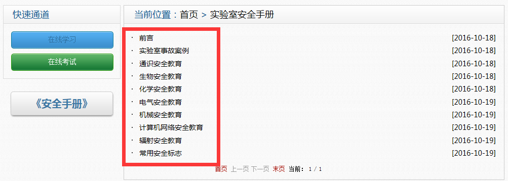 4、进入教育平台,点击“查看安全手册”进行实验室安全知识学习
