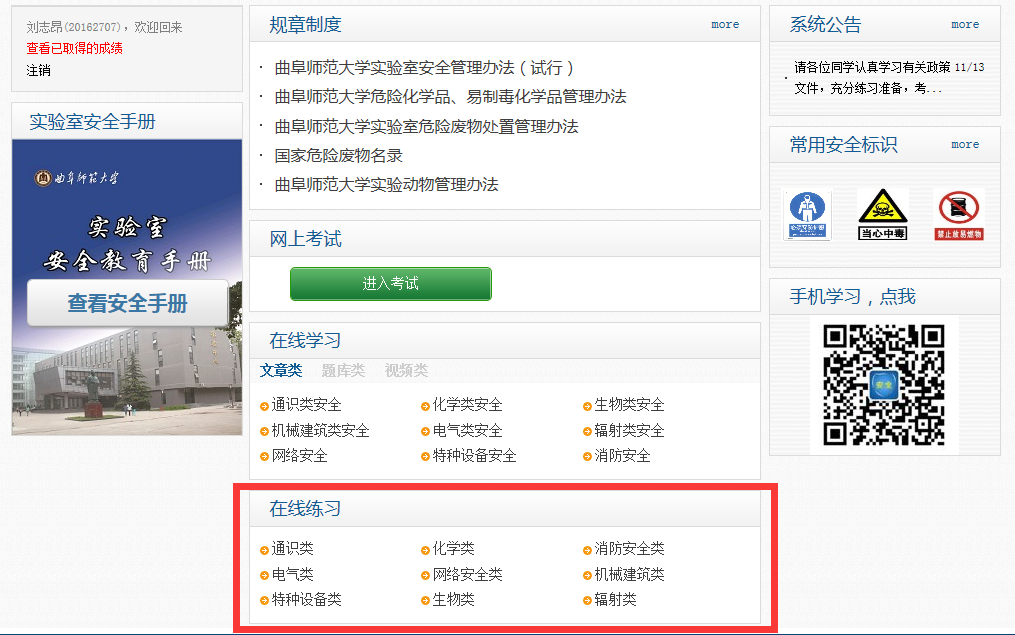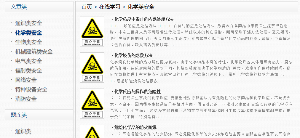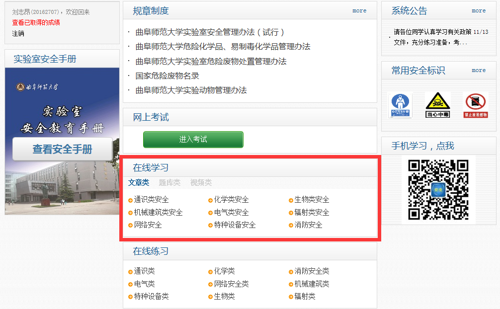 5、点击“在线学习”版块进行各类别实验室安全知识学习