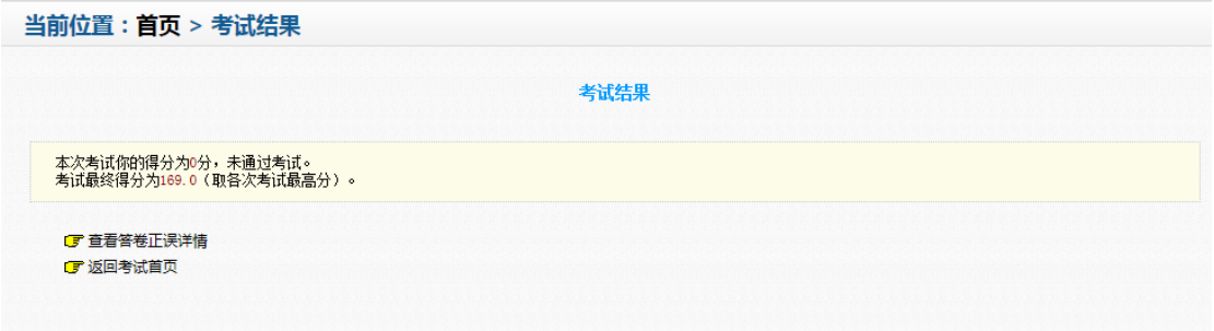 8、显示考试结果即为考试顺利结束,随即方可查看正误详情、返回考试主页 再次考试或关 闭页面