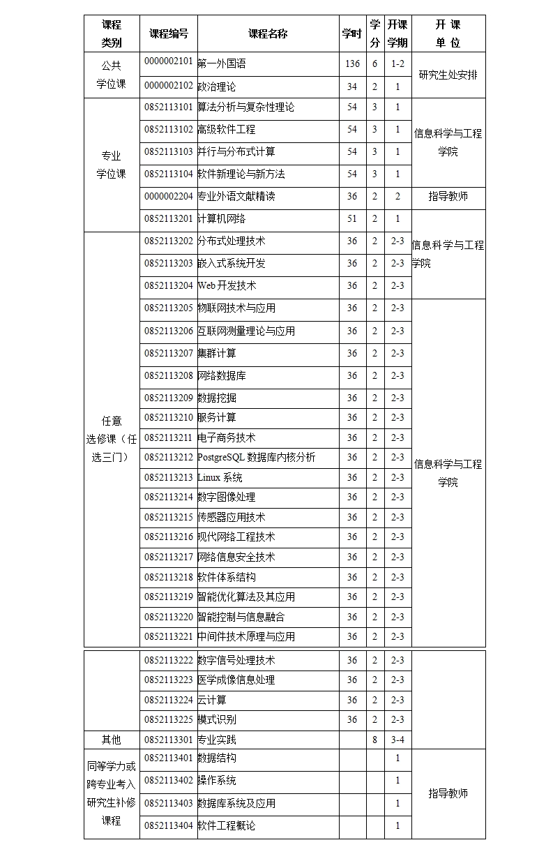 表1 计算机技术领域全日制工程硕士研究生课程设置与教学计划表