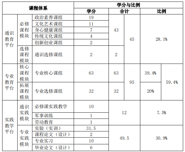 说明:表中通识必修课程模块的43学分中,含通识实践模块中必修课程实践教学的10学分;专业教育平台的95学分中,含专业实践模块实验(实训)的31.5学分。