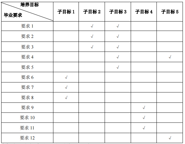 说明:毕业要求对培养目标子目标的支撑用“√”表示。