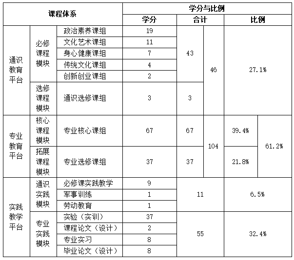 说明:表中通识必修课程模块的46学分中,含通识实践模块中必修课程实践教学的9学分;专业教育平台的104学分中,含专业实践模块实验(实训)的37学分。