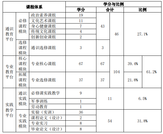 说明:表中通识必修课程模块的43学分中,含通识实践模块中必修课程实践教学的9学分;专业教育平台的104学分中,含专业实践模块实验(实训)的36学分。
