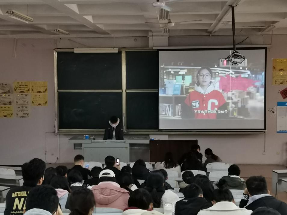 首先,刘国钧同学带领大家观看了反网络电信诈骗宣传教育视频。通过观看视频,同学们认识到各类电信诈骗的特点、典型方式和常见话术,增强了电信诈骗防范意识,有效提高了自身识别电信诈骗的能力。接着,程老师用发生在同学们身边的实际案例,使同学们深刻意识到识别电信诈骗手段的重要性。