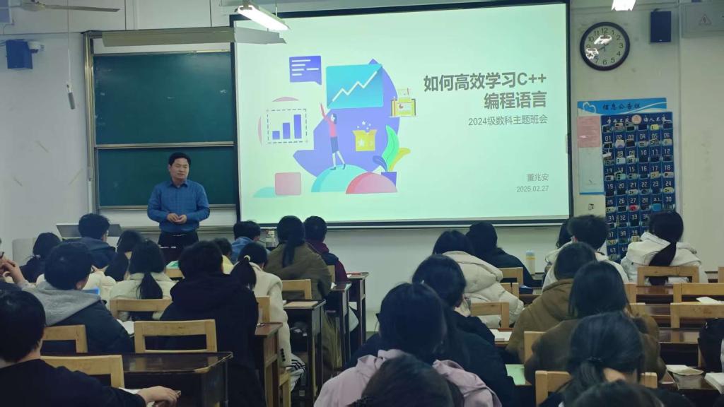2025年2月27日,大数据系2024级本科生在JC412召开“如何高效学习C++编程语言”主题班会。本次班会旨在帮助同学们攻克C++编程语言学习难关,提升学习效率,为后续专业课程学习和实践应用筑牢基础。大数据系主任兼2024数科班班主任董兆安老师主持班会。