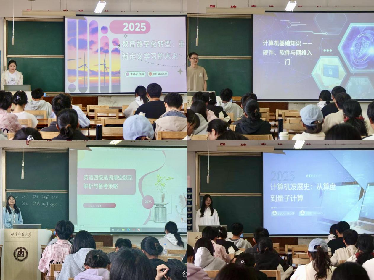 活动中,四位朋辈导师各展所长、立足实际,依次进行课堂展示。张露结合实际案例,介绍了教育领域数字化变革的趋势与应用;宋心萍向同学们详细阐述了从简易计算工具到现代计算机的发展历程;苏之军用浅显易懂的方式讲解了计算机基础知识;贾美慧结合个人经验,分享了四级英语考试中选词填空的技巧与方法。