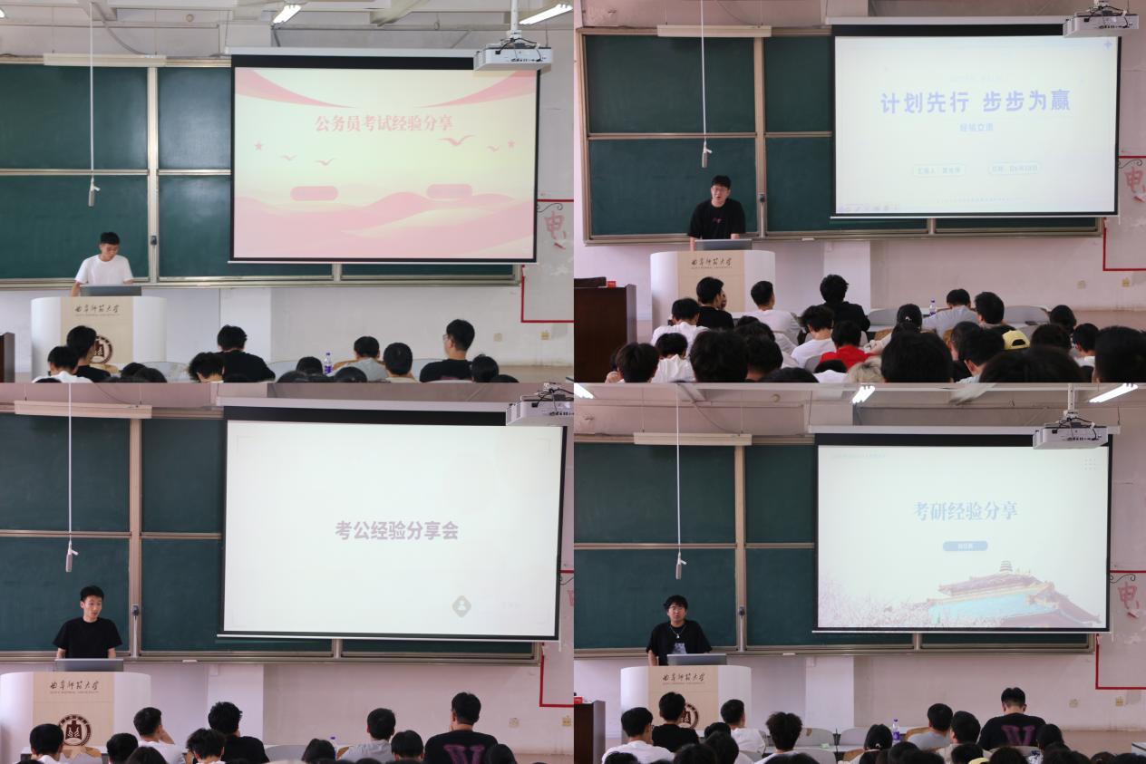 本次分享会分为考研专场和考公专场两个环节。在考研分享中,赵仕灏、焦玉梓、颜嘉颖从院校选择、复习规划、心态调整等方面进行分享,包括择校策略、备考资料获取途径以及高效刷题技巧。他们强调,考研是一场持久战,制定合理的学习计划并严格执行至关重要,同时也要学会在压力中调整心态,保持积极乐观的态度。在考公分享中,王润东、王坤家、官长伟结合自身经历,详细介绍了公务员考试考试题型和备考策略,提醒同学们关注时政热点,加强申论写作和行测解题能力的训练。