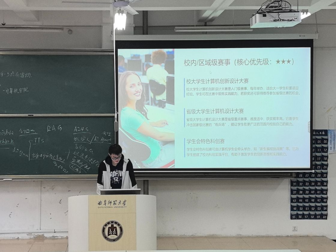 科创部主讲人介绍了计算机领域的科创竞赛,并围绕计算机专业为何需要创新思维、科创比赛的核心价值、重点赛事类型、创新思维实践路径以及如何从“旁观者”转变为“科创实践者”等方面展开讲解,为学生们构建了从认知到实践的全流程参赛指南。