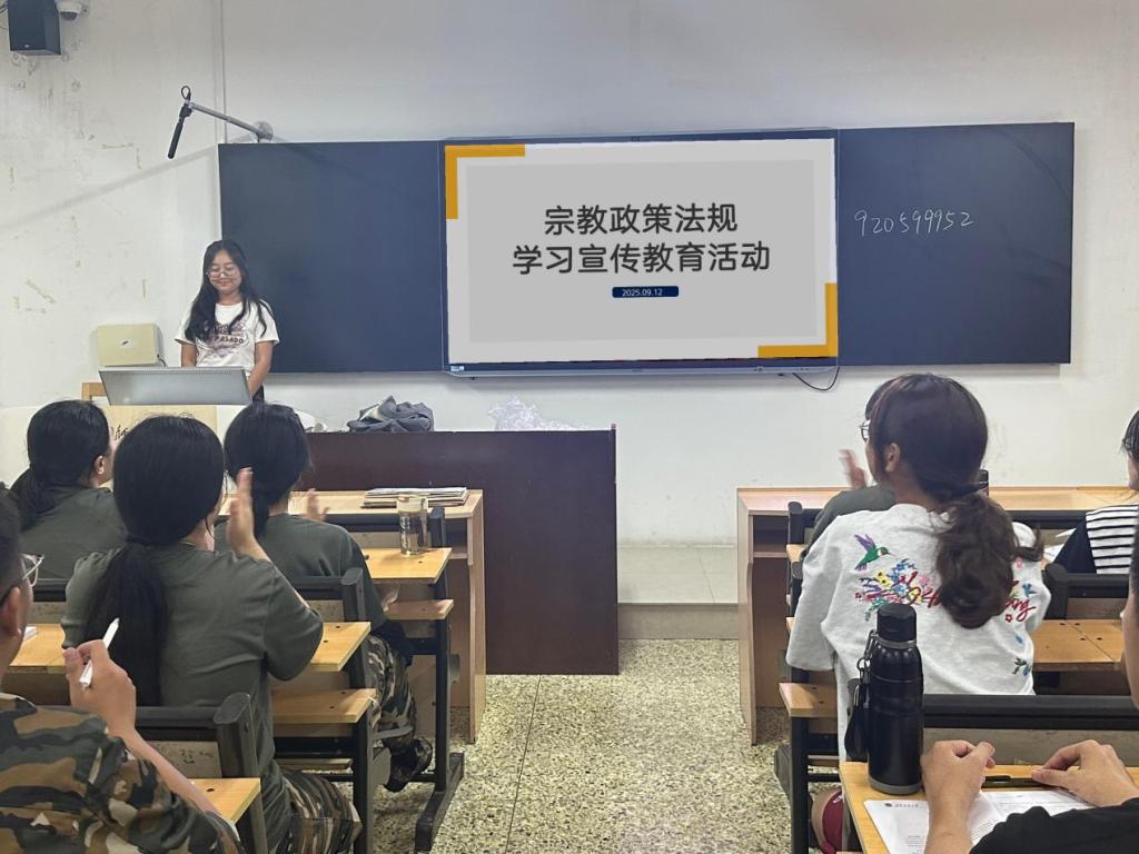 为进一步增强学生对宗教政策法规的认知,筑牢抵制非法宗教活动渗透的思想防线,营造健康、和谐、稳定的校园环境,2025年9月12日,计算机学院组织开展新生宗教政策法规学习和宣传教育活动,全体25级新生参加。