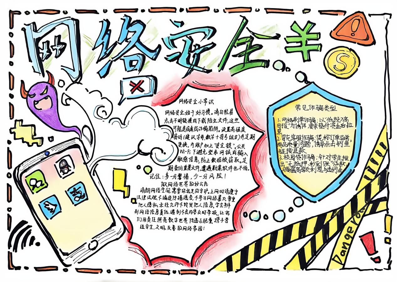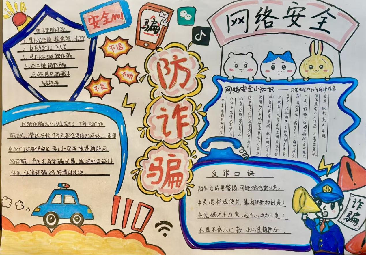 比赛以 “普及防诈知识、锻炼综合能力、强化班级凝聚、营造校园氛围” 为核心目标,要求参赛选手围绕网络防诈骗主题,在手抄报中呈现常见诈骗类型、防诈口诀标语、真实案例分析、应对措施及国家反诈中心 APP 推广等内容,兼具教育性与实用性。