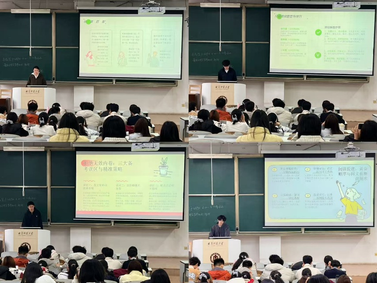 梅晨煜和王怀国为同学们讲解了英语六级考试与四级的不同点,并针对不同点给出针对性的科学备考建议。