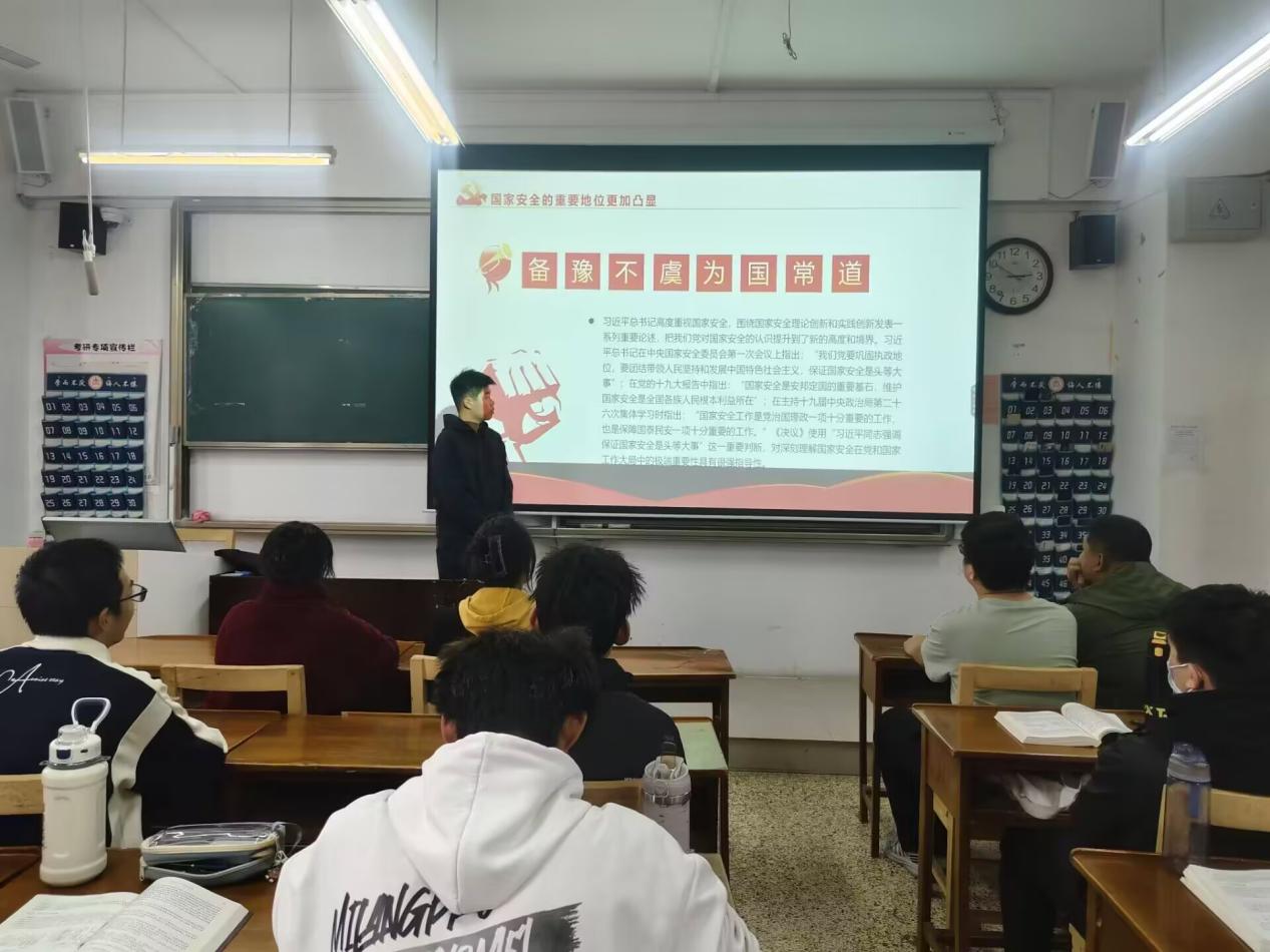 班会伊始,班长首先进行了简明扼要的开场致辞,概述了本次班会的核心主题与预期目标。随后组织委员为同学们讲解国防安全的核心要义、剖析国家安全面临的复杂局势。