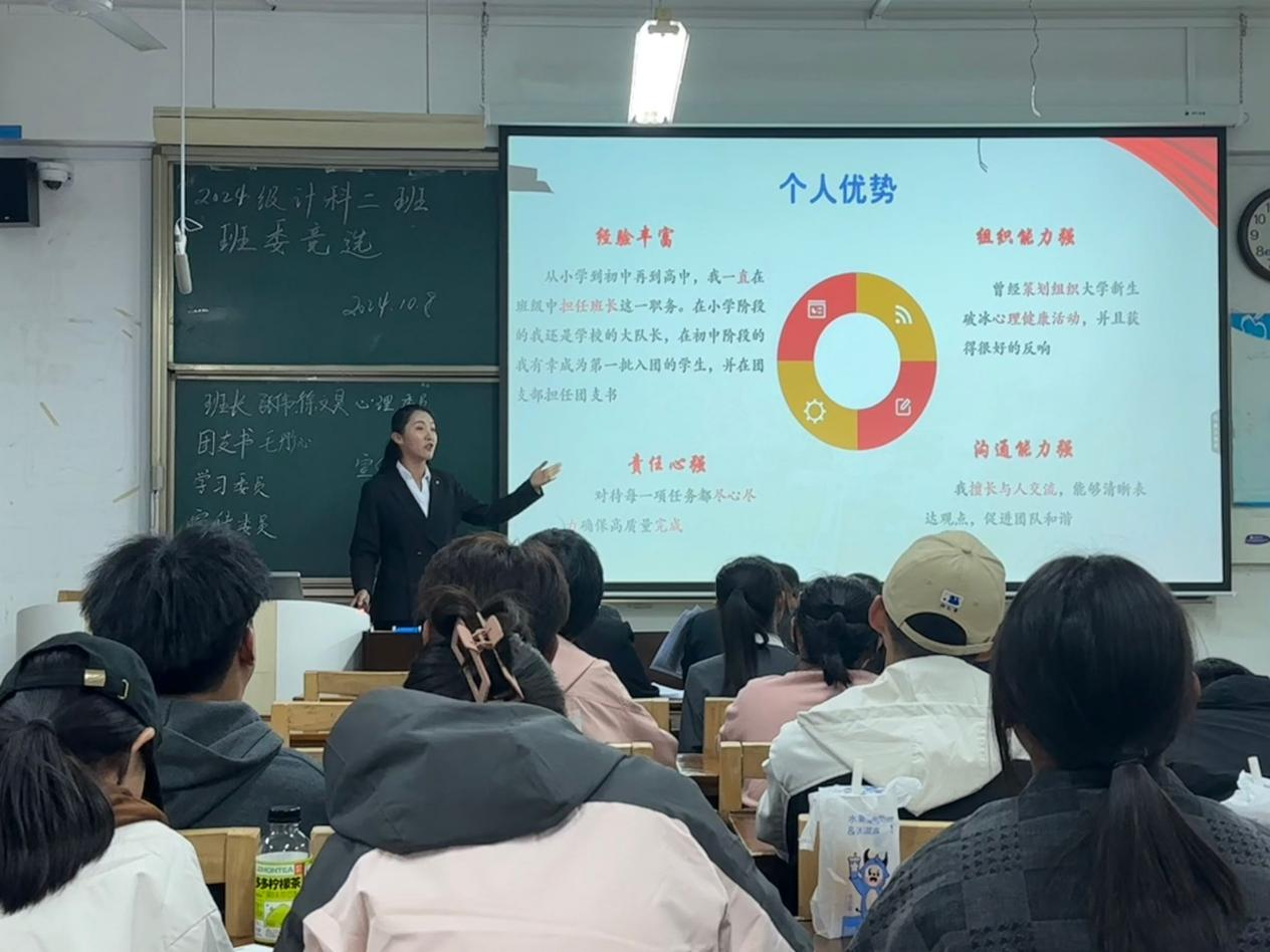 竞选开始,班级内的候选人们依次上台,进行了精彩的竞选演讲。他们分享了个人优势与过往的工作经验,阐述了对班级管理的见解,以及未来工作的规划与设想。候选人们热情洋溢的演讲,不仅展现了个人的风采,更赢得了在场师生的阵阵掌声。