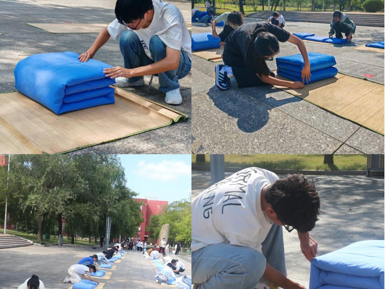 2024级的各个班级。比赛规则要求,每个班级需在四分钟内将平铺的被子叠成方正整齐的“豆腐块”,展示内务整理的熟练程度与认真态度。各班级按照指定的顺序依次上场,同学们在比赛中全神贯注,认真整理被子,不放过任何一点褶皱,力求将被子叠得整齐美观。