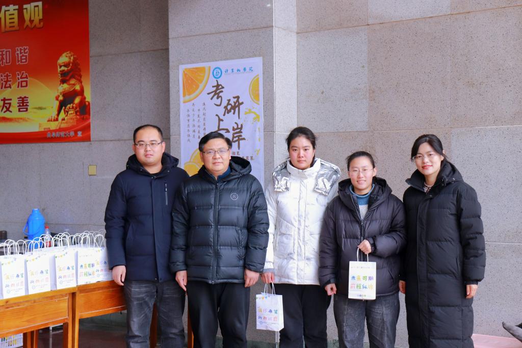 院长李光顺、团委书记于运清、2020级辅导员刘兆宇在C楼大厅为正在准备考研的学生们送上暖心祝福与考研助力包。
