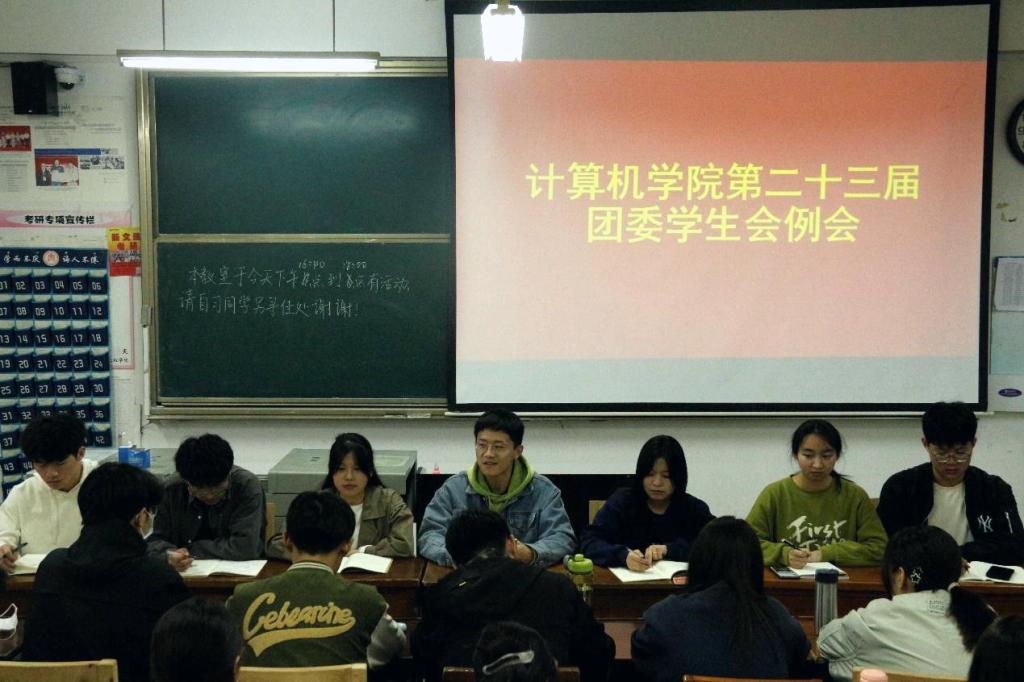 于JC402召开团委学生会例会。学生会成员,各班班长与团支书参与会议。