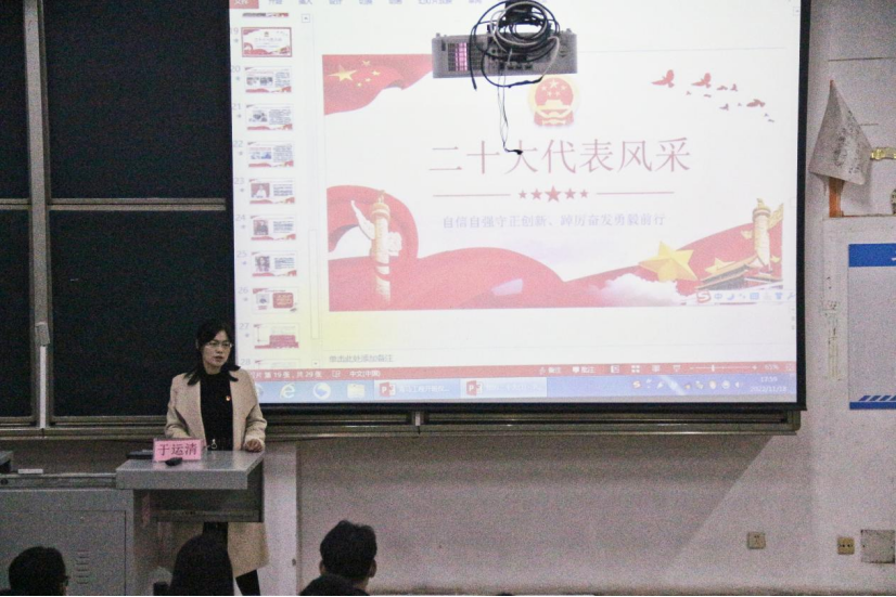 会议伊始,于运清老师便向同学们介绍了二十大会议的主题以及二十大会议召开的重大意义,让同学们明确认真学习贯彻落实党的二十大精神是一项非常重要的任务。接着,于运清老师又结合自身的学习与感悟,向同学们讲解了党的二十大报告的主要内容,并着重阐释了“中国式现代化”的概念和本质要求。在讲解了二十大报告内容后,于运清老师又向同学们讲述了部分二十大代表的光荣事迹,为同学们树立了学习的标杆。最后,于运清老师着重强调了习近平总书记对新时代青年寄予厚望,号召同学们牢记习近平总书记对青年人的勉励,秉持“青年强则国家强”的信念,坚定不移听党话、跟党走,立志做有理想、敢担当、能吃苦、肯奋斗的新时代好青年。