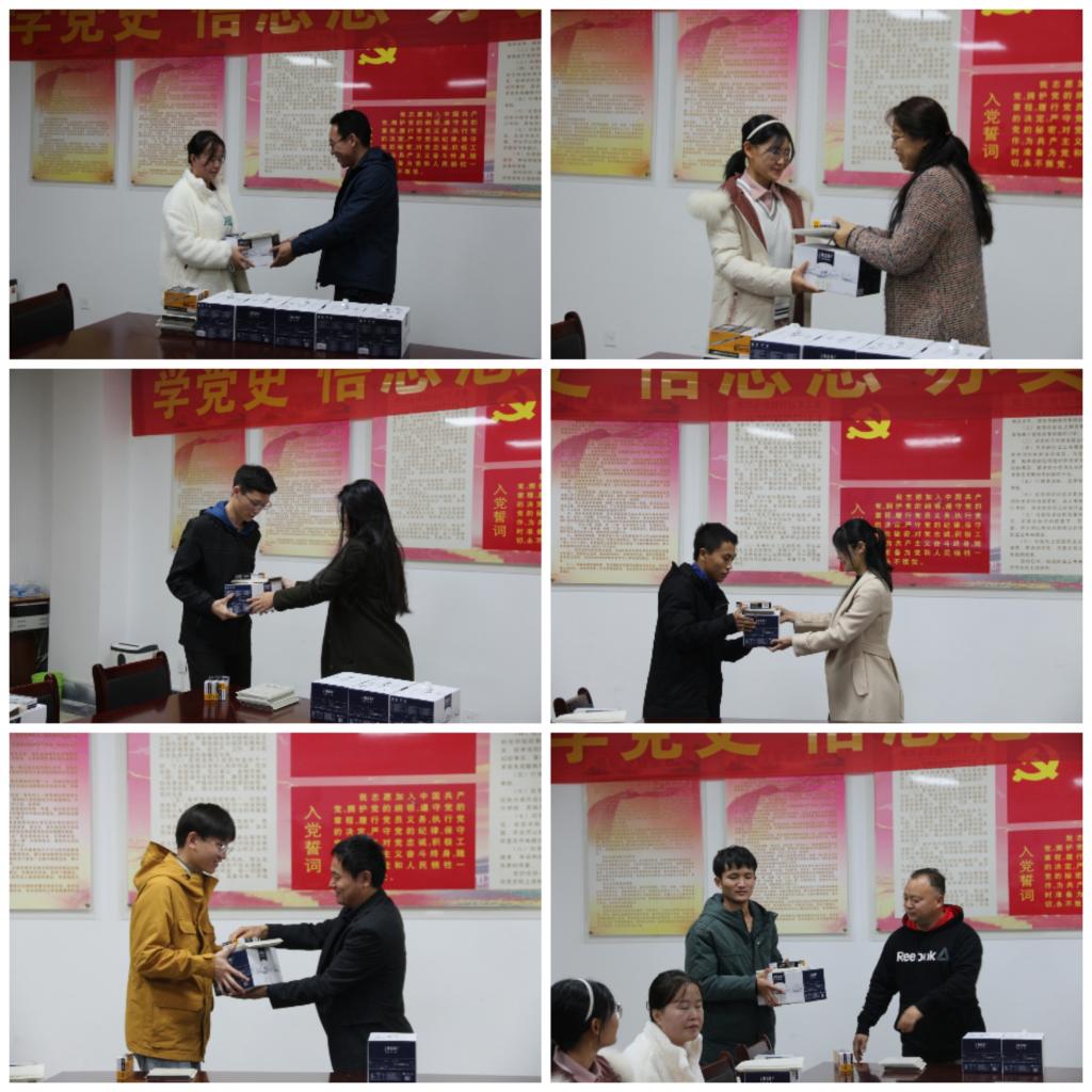 最后,老师们向学生发放牛奶、笔记本等学习生活用品,送上冬日的温暖。教工党支部书记王伊蕾以PPT的形式为同学们上了一节职业规划课程,激励同学们学好专业知识,未来再接再厉、砥砺前行,为创造美好的生活不懈奋斗。