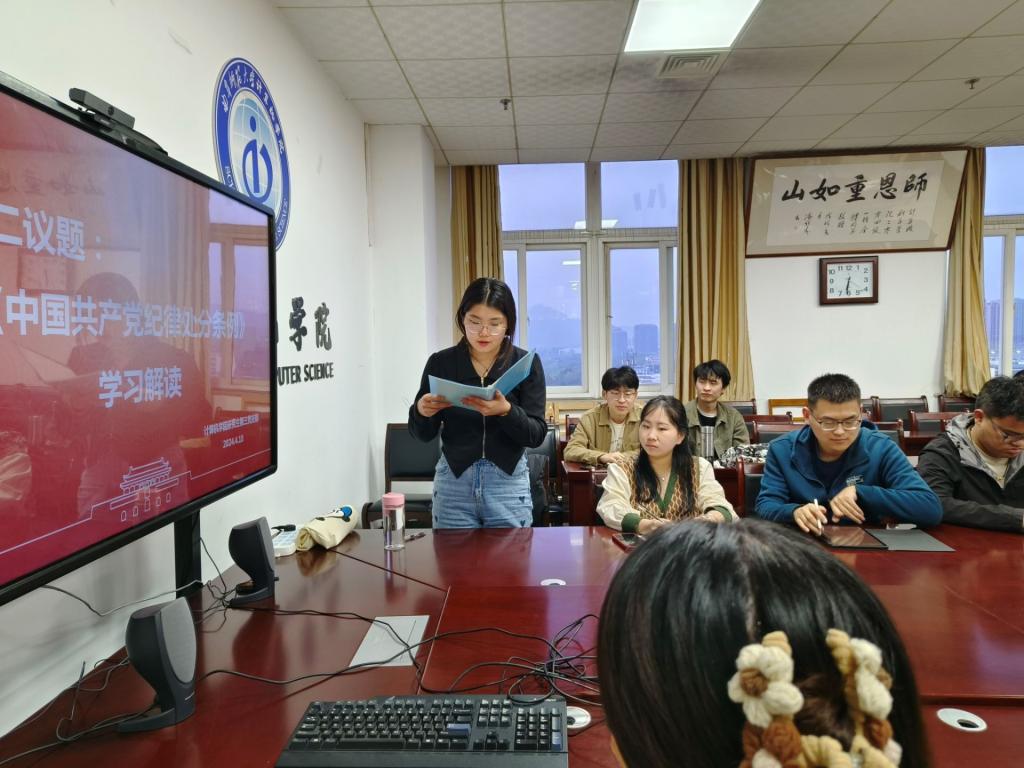 会议第二项,党支部书记程荣花老师首先传达了学院党委关于开展党纪学习教育工作的指示,启动部署研究生第三党支部党纪学习教育工作。接着,程老师带领支部党员共同学习了《中国共产党纪律处分条例》第一编总则中的所有内容。通过学习,党员们清楚知道了中国共产党纪律处分的总体要求和适用范围、违纪行为与纪律处分种类、纪律处分适用规则以及对违法犯罪党员的纪律处分规定等。