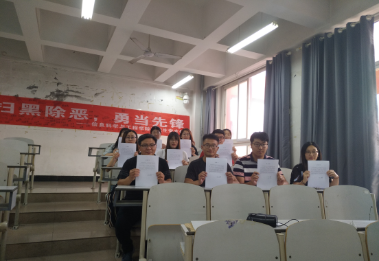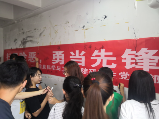 最后李老师老师全院研究生传达了“扫黑除恶、勇当先锋”主题。全体研究生在“扫黑除恶、勇当先锋”宣传横幅上签订自己的姓名,表示响应扫黑除恶专项斗争政策法规研究生党支部全体党员在承诺书上签名,不参加涉黑组织,并及时举报发现的涉黑涉恶线索配合扫黑除恶专项斗争开展。